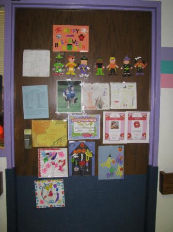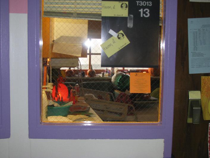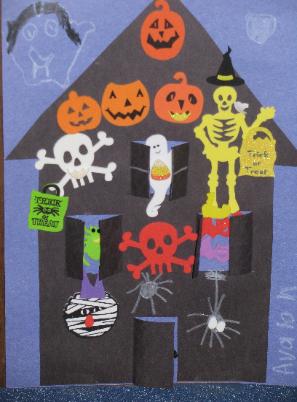 Child life brought in the Haunted House cut out of paper. Then, she helped Avalon glue the house on a background and decorate it using some of the foam stickers I bought and a white crayon. I love it!