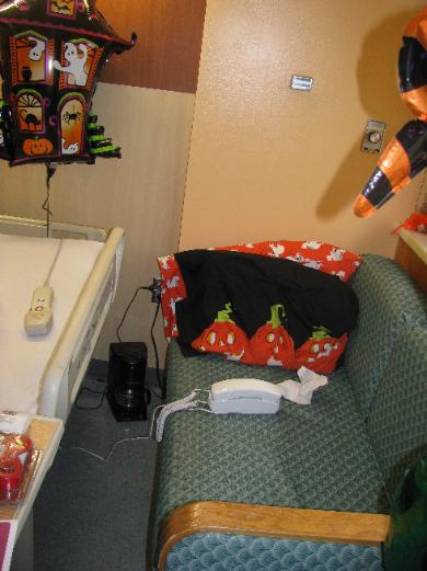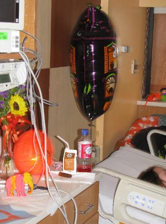 Flowers from a much-loved friend. Avalon's light up pumpkin. A fantastic Haunted House balloon from Aunt Nettie. Avalon's painted pink and yellow striped elephant.
