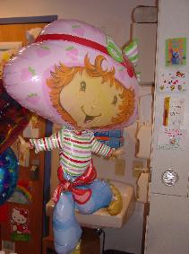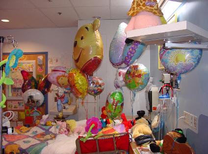 | More than most floors...Heme-Onc really is one giant family. Each of us have been thrown into this nightmare, and we all realize the balancing act that we have in common. Strangers hug each other with more meaning and love than some blood families, and a child's smile as you pass them in the hall, can make your heart sing as if you'd known them all their life. This visit illustrated that as clearly as ever. The giant Pooh balloon was part of Avalon's birthday gifts from a fellow patient (and dear friend), Abbey. Abbey is our tea party friend from a few emails ago. The Strawberry shortcake balloon is from another patient's family. Although that family knew Abbey as well, we had never met them. Strawberry came to live with us as a special birthday surprise, because they hated the fact that anyone would have to be there for their birthday. We had never met, but they loved Avalon enough to reach out...just because. And sometimes, angels really are just moms... |